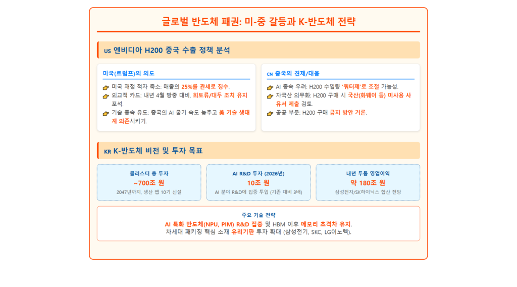 - 미국의 정책: 트럼프 2기 행정부는 '국가안보'에서 '수익' 중심으로 정책을 선회하여, 엔비디아의 최신 칩(H200) 대중 수출을 허용하되 25% 수수료를 부과하는 방안을 추진 중입니다.