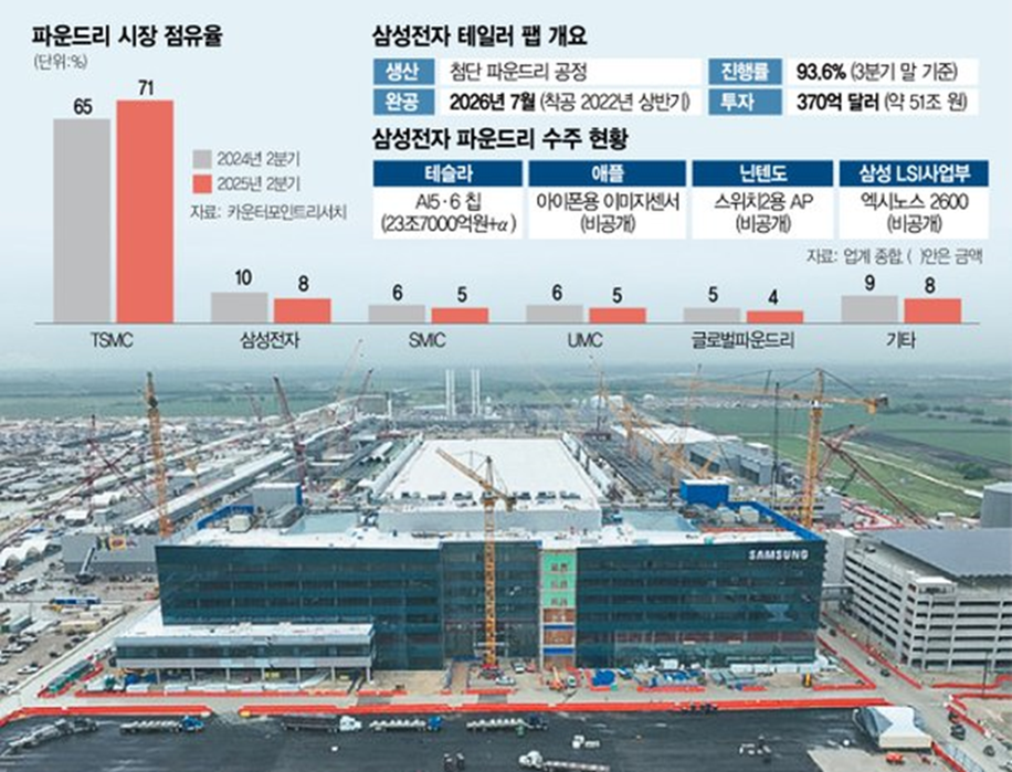 삼성전자는 미국 테일러 파운드리 공장의 내년 하반기 양산을 목표로 본사 인력을 대거 투입하며 가동 준비를 서두르고 있습니다. 특히 일론 머스크 테슬라 CEO가 이재용 회장과 함께 테일러 공장을 방문하여 장비 반입 등 세부 사항을 직접 챙기는 등 파격적인 행보를 보였습니다. 테슬라는 삼성전자와 약 24조 원 규모의 차세대 AI 칩 'AI6' 생산 계약을 체결한 데 이어 'AI5' 개발에도 삼성을 파트너로 선정했습니다. 이는 지정학적 리스크로 인해 공급망 다변화가 필요한 빅테크 기업들이 삼성의 미국 내 첨단 공정에 주목하고 있음을 시사합니다.