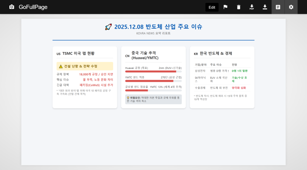 - 중국은 자국산 칩 사용 의무화와 국산화율 확대를 통해 기술 자립을 가속화하며, 미국은 인텔 지분 확보 등 전략적 투자를 검토 중이다.